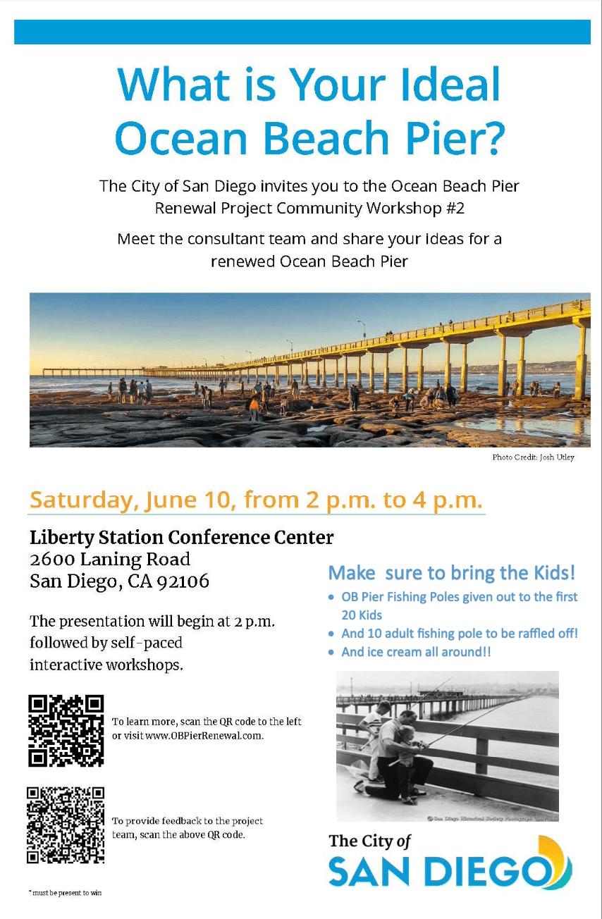For more information go to www.obpierrenewal.com. The public can provide input here: Ocean Beach Pier Renewal Project Survey (surveymonkey.com)