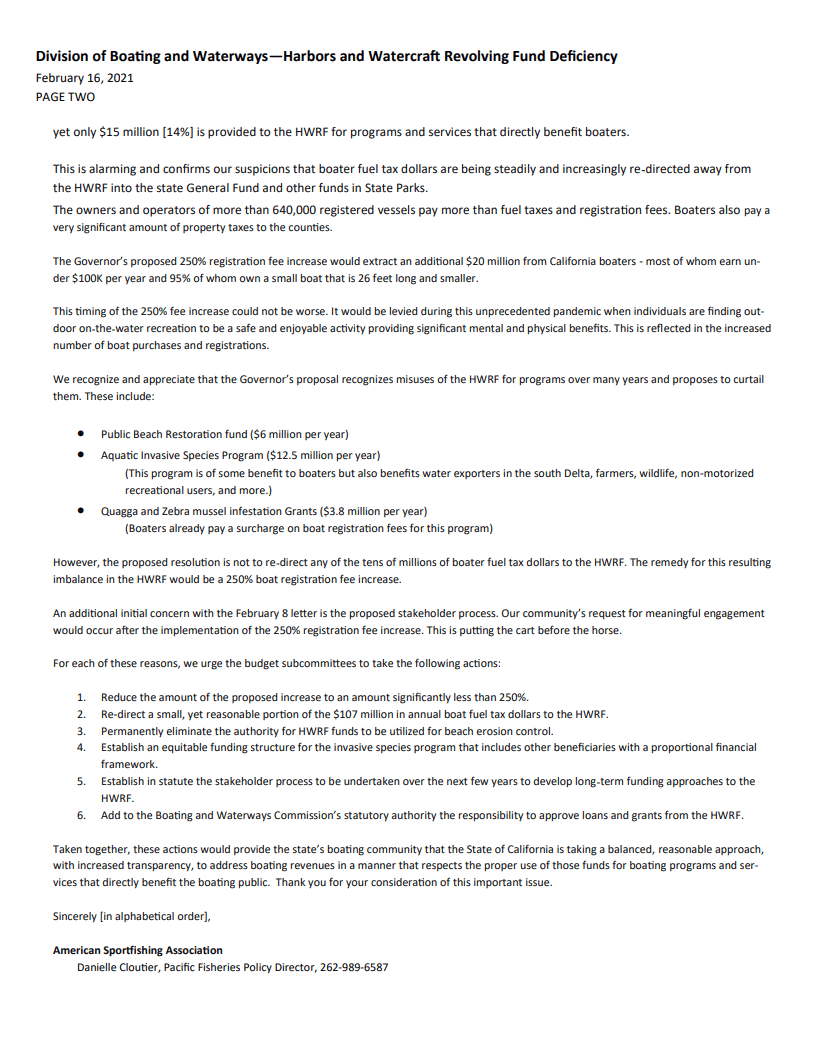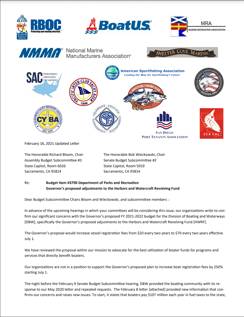 CCA CAL has signed on to a letter with other organizations that oppose a potential increase in vessel registration fees, which would increase almost 250% starting July 1st. You can read that letter down below: