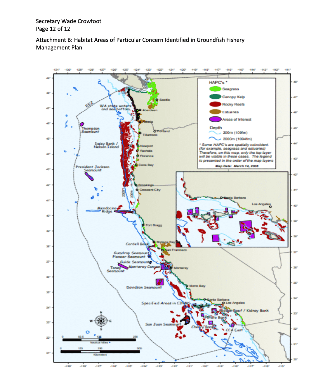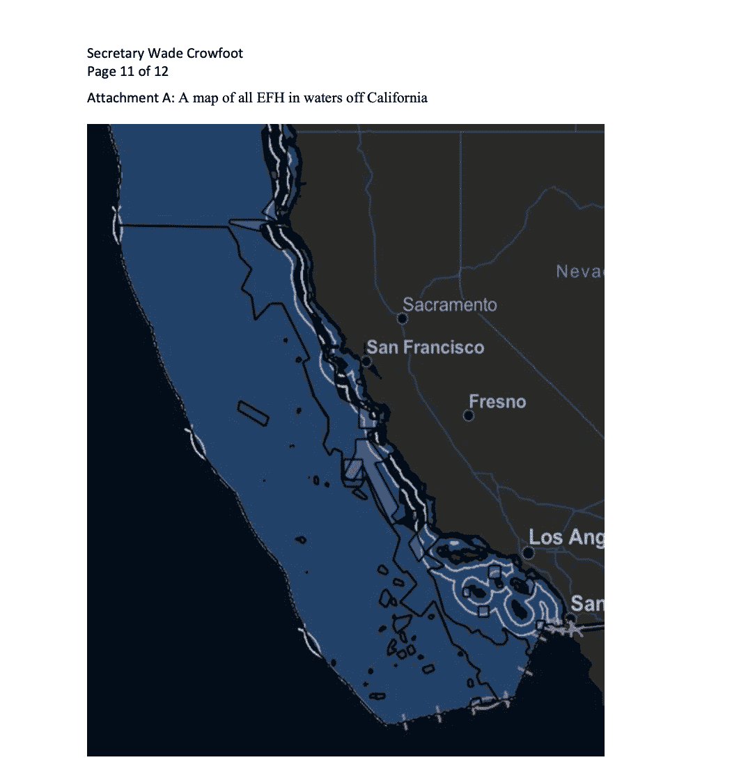 Section 303(a)(7) of the Magnuson-Stevens Fishery Conservation and Management Act requires NOAA’s National Marine Fisheries Service (NMFS) to take steps to minimize to the extent practicable adverse effects of fishing on essential fish habitat (EFH). NMFS works with the Pacific Fishery Management Council to protect EFH in support of healthy ecosystems and sustainable fisheries in the U.S. Pacific Ocean. A map of all EFH in waters off California is attached to this comment letter (Attachment A). https://www.habitat.noaa.gov/application/efhinventory/docs/pfmc_datasheet.pdf