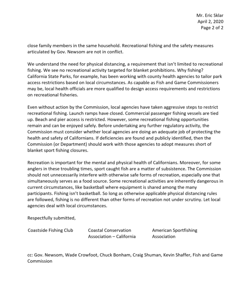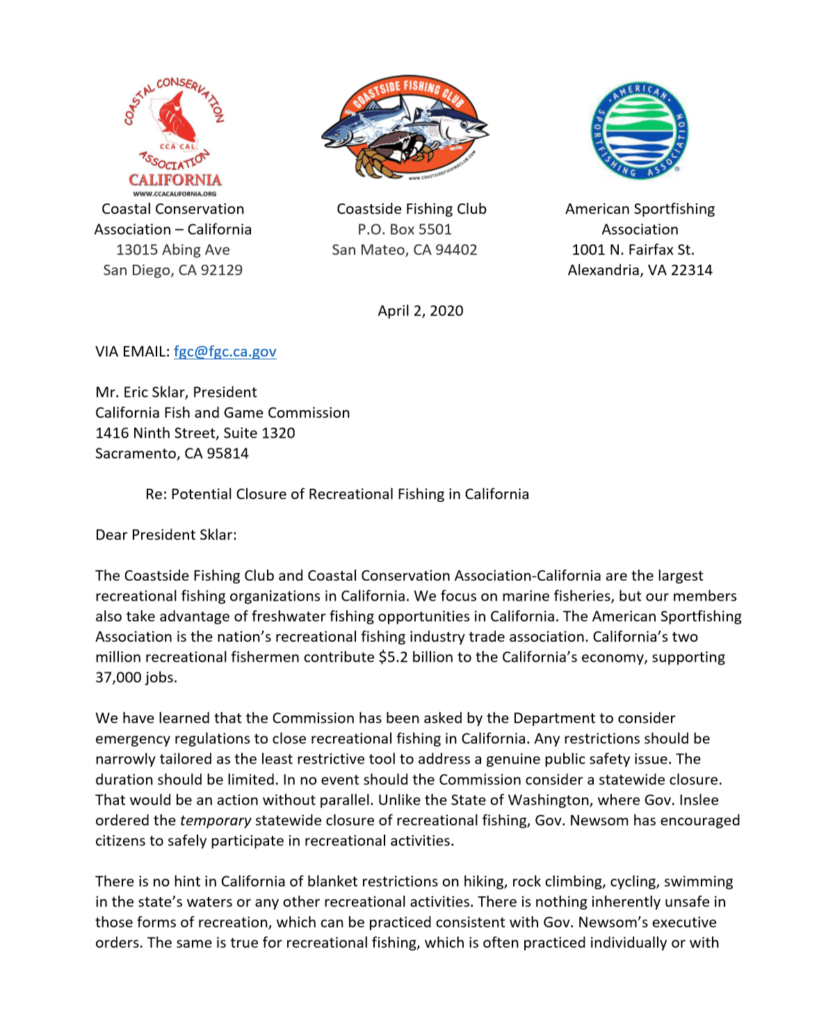 The Coastal Conservation Association California (CCA CAL), Coastside Fishing Club and The American Sportfishing Association have submitted a letter to the California Fish & Game Commission in response to the California Department of Fish & Wildlife asking the Commission to consider emergency regulations to close recreational fishing in California.