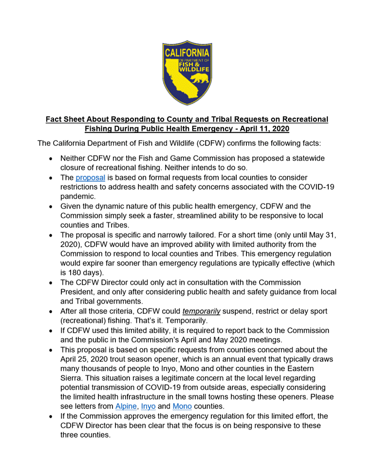 The California Department of Fish & Wildlife has released a fact sheet filled with information regarding the goal and intentions of this Wednesday’s California Fish & Game Commission Emergency Meeting. That meeting will begin at 10am. You can find the fact sheet below: