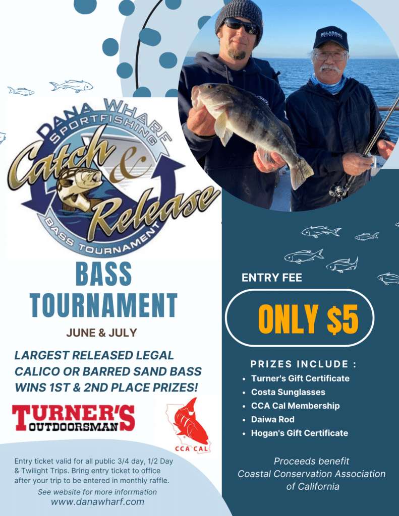 Dana Wharf Sportfishing has launched its daily Catch & Release Bass Tournament for anglers fishing aboard the landing’s open ½-day, ¾-day and twilight trips throughout June and July, 2023. Daily entry fee is just $5 to compete to catch the largest, released calico or barred sand bass on each trip. Both first and second place win prizes, and all entries are also entered into monthly prize raffles.