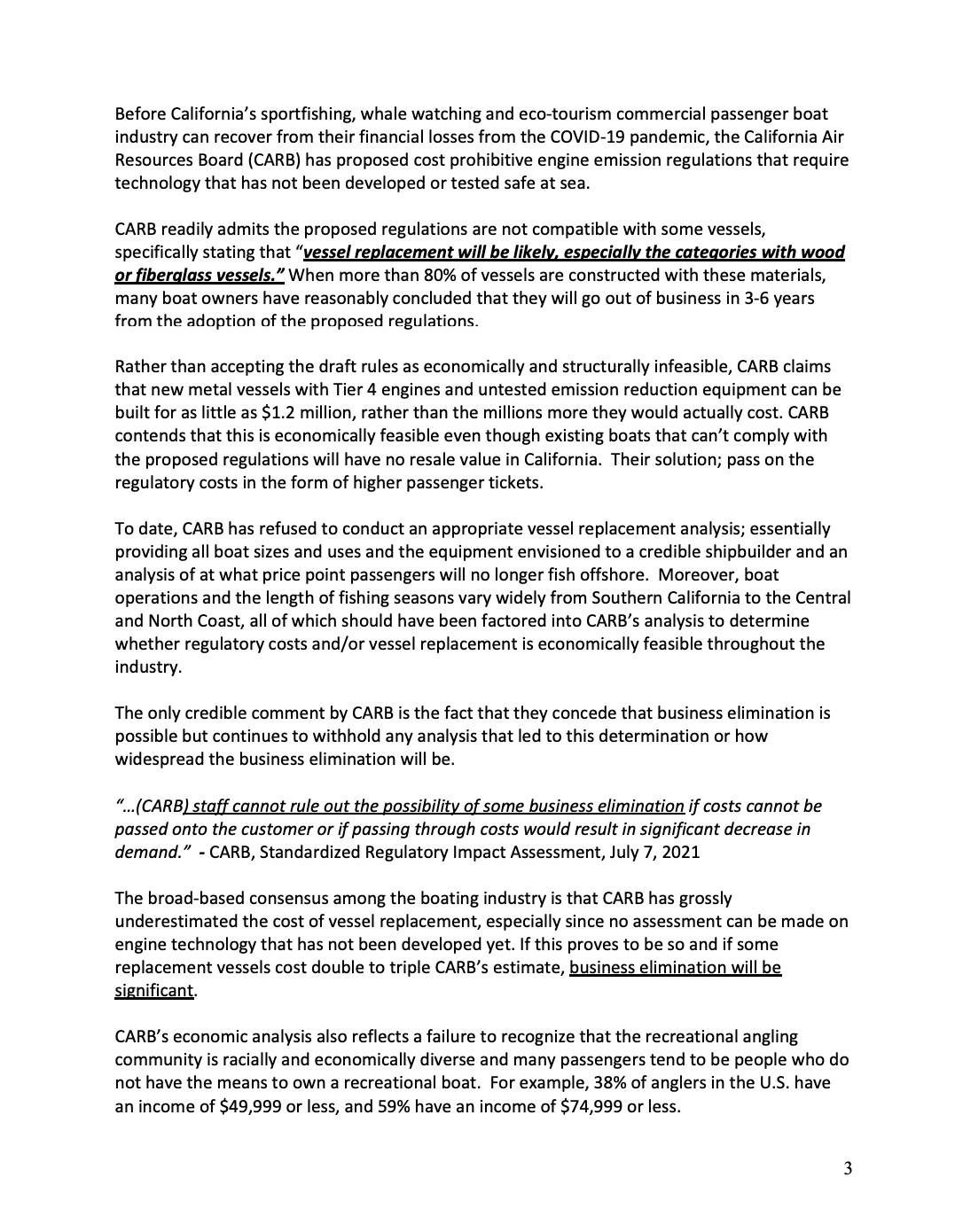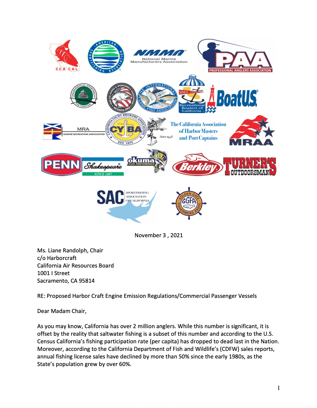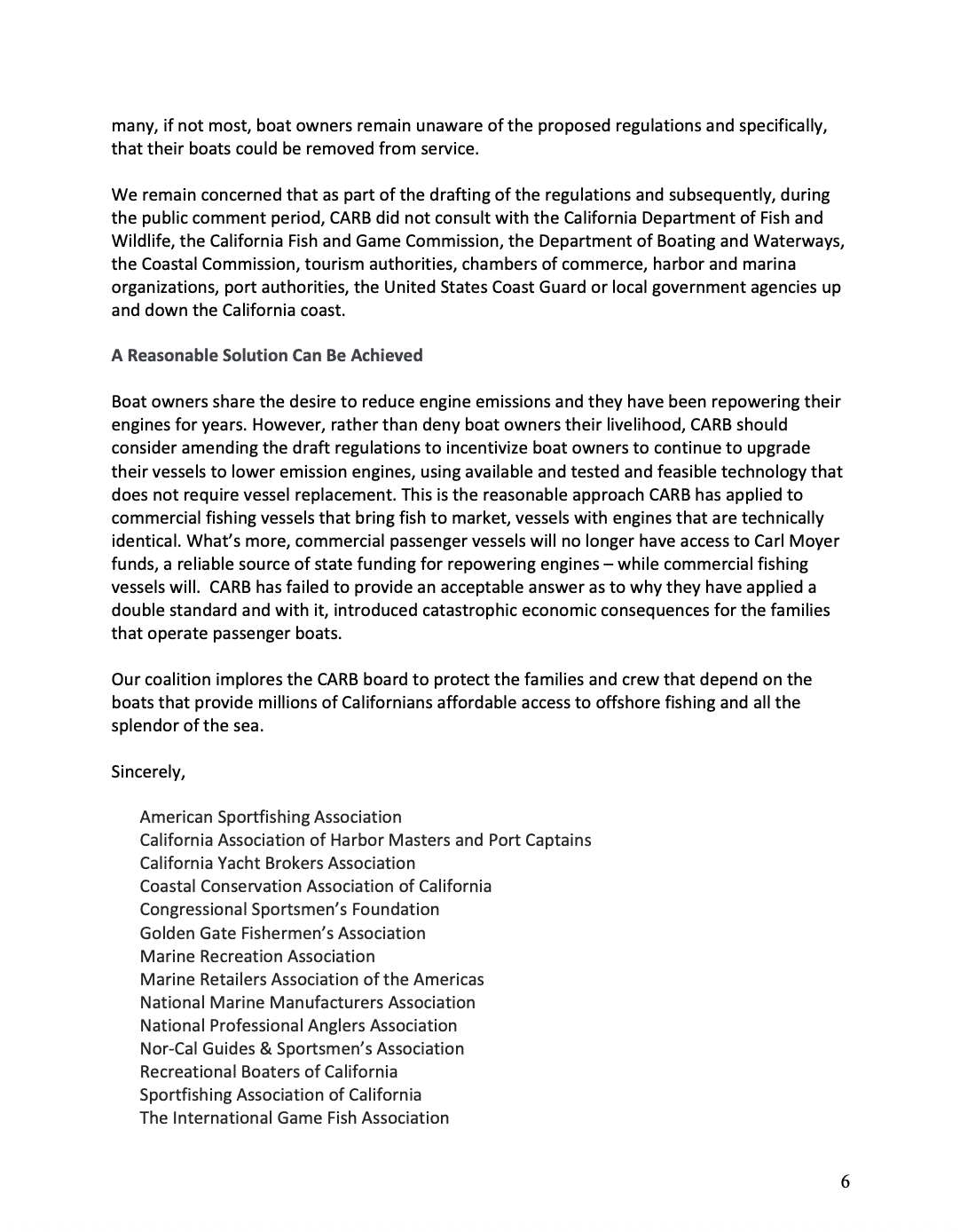 In the coalition’s letter to the CARB Board, the coalition expresses concerns associated with engine emission regulations that are economically and structurally infeasible for commercial passenger boats that provide millions of Californians and foreign visitors access to sportfishing, whale watching, eco-tourism and scuba diving. By CARB’s own admission, if the regulations are adopted, boat owners that can’t afford to construct and purchase new compliant vessels that can house the mandated heavier Diesel engines and equipment would be required to go out of business as early as January 2023.