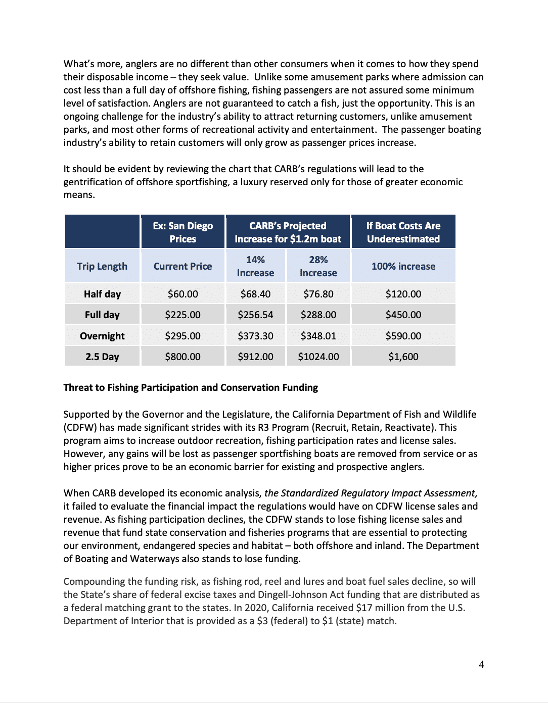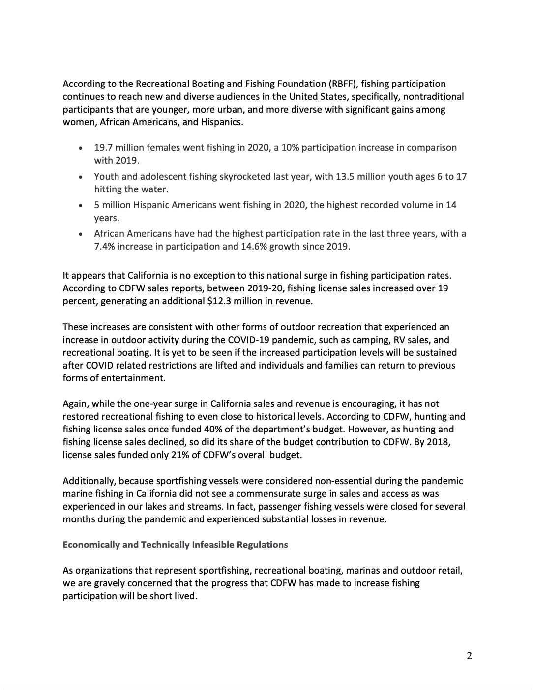 The letter highlights that during the COVID-19 pandemic the Nation experienced a surge in fishing participation that include diverse audiences, specifically, nontraditional participants that are younger, more urban, and more diverse with significant gains among women, African Americans, and Hispanics. The coalition is concerned that as passenger sportfishing boats are removed from service or passenger ticket prices are increased to pay for regulatory costs, it will only undermine recent progress made by the California Department of Fish and Wildlife (CDFW) to increase fishing participation and license sales that fund the department’s conservation and fishery programs. California’s fishing participation rate (per capita) is the lowest in the Nation, demonstrating how fragile the recent increase in participation may be if CARB rules make it unaffordable.