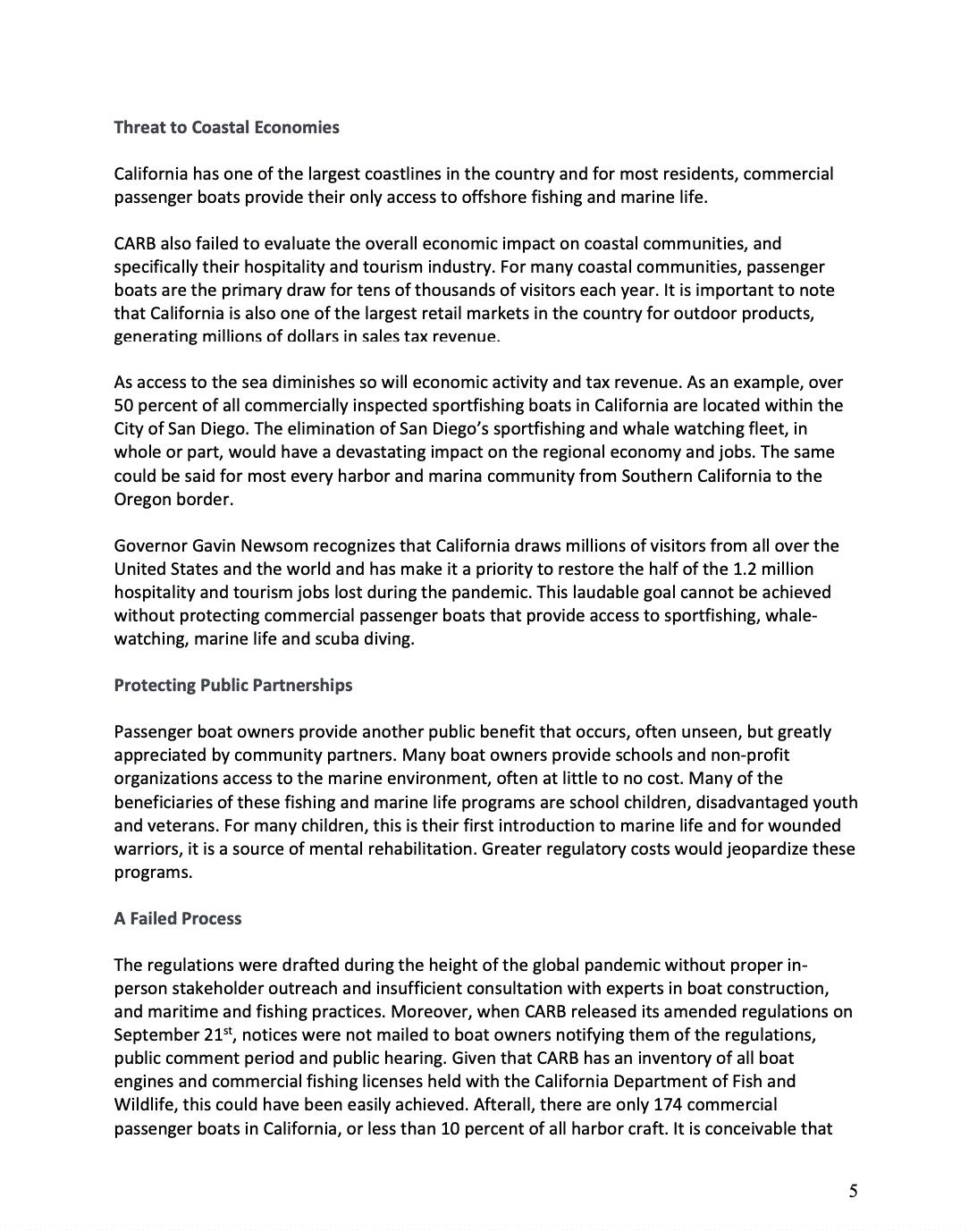 Additionally, CARB’s Standardized Regulatory Impact Assessment failed to examine the economic impacts on coastal tourism and outdoor retail sales at a time when Governor Gavin Newsom has made it his priority to restore the half of 1.2 million hospitality and tourism jobs lost during the COVID-19 pandemic.